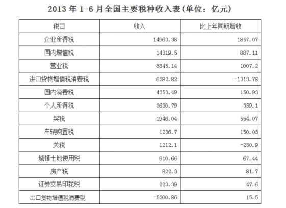 2013年二季度,我國(guó)稅收月收入同比增速逐步提高,分別為7.9%,8.3%和12.9%。截至2013年6月,全國(guó)稅收總收入完成59260.61億元,同比增長(zhǎng)7.9%,較上年同期回落1.9個(gè)百分點(diǎn)。其中,國(guó)內(nèi)增值稅、企業(yè)所得稅同比分別增長(zhǎng)6.6%和14.2%,較上年同期增速分別回落1.5和3.1個(gè)百分點(diǎn);房產(chǎn)稅同比增長(zhǎng)11%,比上年同期增速回落19.1個(gè)百分點(diǎn);進(jìn)口貨物增值稅消費(fèi)稅和關(guān)稅同比分別下降17.1%和16%。比上年同期增速分別回落24.5和22.9個(gè)百分點(diǎn)。