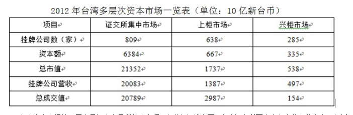 臺(tái)灣資本市場(chǎng)第三層次是興柜市場(chǎng)。在準(zhǔn)入門(mén)檻方面,興柜市場(chǎng)沒(méi)有營(yíng)業(yè)利潤(rùn)、資本額、設(shè)立年限的限制,只須符合已經(jīng)申報(bào)上市或上柜輔導(dǎo)且有兩家以上證券商書(shū)面推薦。至2012年底,興柜公司有285家,資本額0.335兆新臺(tái)幣,總市值0.538兆新臺(tái)幣。