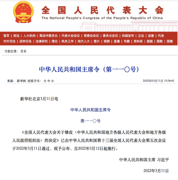 (2022年3月11日第十三屆全國人民代表大會第五次會議通過)