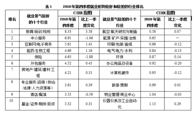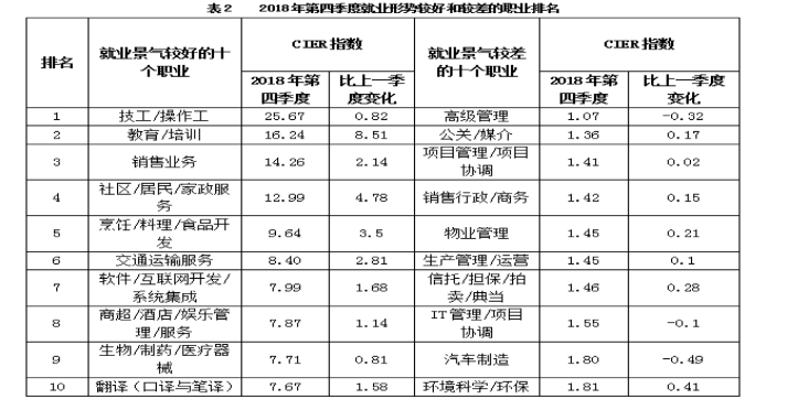 CIER指數(shù)用來反映就業(yè)市場景氣程度,其計(jì)算方法是:CIER指數(shù)=市場招聘需求人數(shù)/市場求職申請人數(shù)。根據(jù)有關(guān)機(jī)構(gòu)發(fā)布的數(shù)據(jù),2018年第一季度CIER指數(shù)為1.91,第二季度為1.88,第三季度為1.97,第四季度為2.38。2018年第三季度,招聘需求人數(shù)環(huán)比下降20.79%,求職申請人數(shù)環(huán)比下降24.37%;第四季度,招聘需求人數(shù)環(huán)比增加25.42%,求職申請人數(shù)環(huán)比增加3.9%。