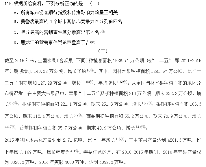 117.對(duì)“十二五”期間水果種植面積增長(zhǎng)貢獻(xiàn)最大的果品是:( )
