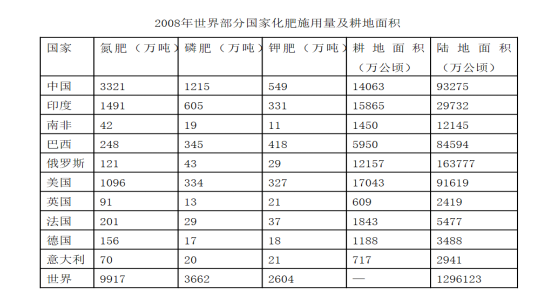 D、在上述國(guó)家中,2008年耕地面積最少的國(guó)家也是上述三種化肥施用量最少的國(guó)家