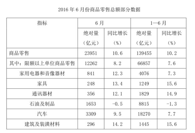 按消費類型分,2016年6月份,餐飲收入2907億元,同比增長11.1%;商品零售23951億元,同比增長10.6%。1-6月份,餐飲收入16683億元,同比增長11.2%;商品零售139455億元,同比增長10.2%。