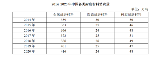 耐磨材料可分為金屬耐磨材料、陶瓷耐磨材料和樹脂耐磨材料,2014—2020年各類耐磨材料的消費(fèi)量如下表所示: