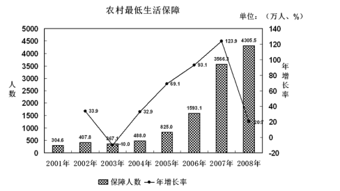 C、2001至2008年,農(nóng)村居民中最低生活保障人數(shù)逐年遞增