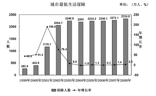 A、2001年至2008年,城市居民最低生活保障人數(shù)的增長速度高于農(nóng)村居民最低生活保障人數(shù)的增長速度。