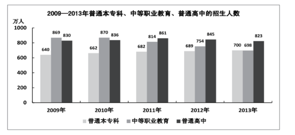 D、2009—2013年,普通本??频恼猩藬?shù)總是比中等職業(yè)教育少