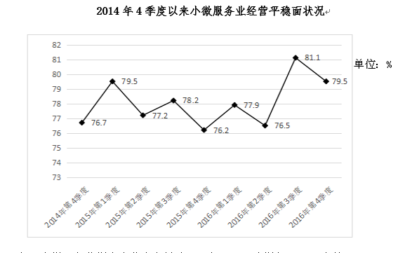 2016年,該省小微服務(wù)業(yè)樣本企業(yè)實(shí)現(xiàn)營業(yè)收入80.1億元,同比增長(zhǎng)15.4%,高于規(guī)模以上重點(diǎn)服務(wù)業(yè)企業(yè)8.2個(gè)百分點(diǎn),增速比上年回落0.6個(gè)百分點(diǎn)。經(jīng)營平穩(wěn)面擴(kuò)大,2016年4季度,79.5%的企業(yè)認(rèn)為本企業(yè)綜合經(jīng)營狀況良好或穩(wěn)定,同比提高3.3個(gè)百分點(diǎn),處于歷史較高水平。