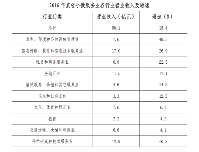 2016年,某省小微服務(wù)業(yè)呈現(xiàn)出經(jīng)營平穩(wěn)面、資產(chǎn)規(guī)模、享受稅收優(yōu)惠政策范圍“三擴(kuò)大”的特點(diǎn),主要行業(yè)實(shí)現(xiàn)較快增長(zhǎng)。