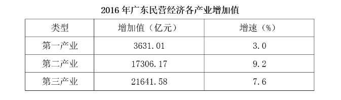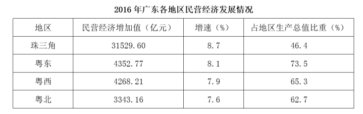 2016年,廣東民營經(jīng)濟(jì)增加值突破四萬億元。經(jīng)初步核算,全年實(shí)現(xiàn)民營經(jīng)濟(jì)增加值42578.76億元,按可比價(jià)計(jì)算,比上年同期增長(zhǎng)7.8%,增幅高于同期GDP增幅0.3個(gè)百分點(diǎn),其中第二產(chǎn)業(yè)增幅比同期GDP第二產(chǎn)業(yè)增幅高3個(gè)百分點(diǎn)。民營經(jīng)濟(jì)占GDP的比重為53.6%,比2010年提高3.9個(gè)百分點(diǎn),占比逐年提高;對(duì)GDP增長(zhǎng)的貢獻(xiàn)率為55.5%,同比提高1.3個(gè)百分點(diǎn),拉動(dòng)GDP增速達(dá)4.2個(gè)百分點(diǎn),民營經(jīng)濟(jì)的作用不斷提升,是廣東經(jīng)濟(jì)增長(zhǎng)的主力軍。