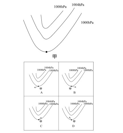 77、一般而言,在北半球地轉(zhuǎn)偏向力會使風(fēng)向右偏離其原始的路線。圖中顯示的是位于北半球的甲地的等壓線分布情況,則甲地的風(fēng)向最可能是( )。