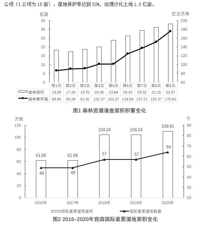 增加森林面積、提高森林質(zhì)量、提升生態(tài)系統(tǒng)碳匯增量,將為我國(guó)實(shí)現(xiàn)碳達(dá)峰、碳中和目標(biāo)、維護(hù)全球生態(tài)安全做出巨大貢獻(xiàn)。1973年,我國(guó)開展了第一次森林資源清查。目前已完成第9次森林資源清查,我國(guó)森林面積和森林蓄積量連續(xù)30年保持“雙增長(zhǎng)”。“十三五”時(shí)期,我國(guó)累計(jì)造林5.45億畝,森林覆蓋率達(dá)到23.04%,森林蓄積量為175.6億立方米,森林面積達(dá)到2.2億公頃(1公頃為15畝)。濕地保護(hù)率達(dá)到52%,治理沙化土地1.5億畝。