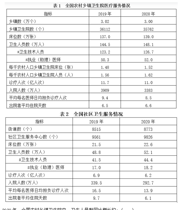 C.2019-2020年,全國(guó)鄉(xiāng)鎮(zhèn)衛(wèi)生院年平均入院人數(shù)是全國(guó)社區(qū)服務(wù)中心的十倍以上