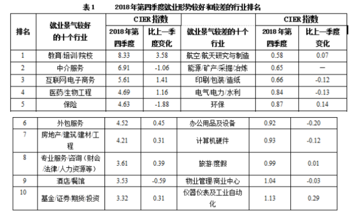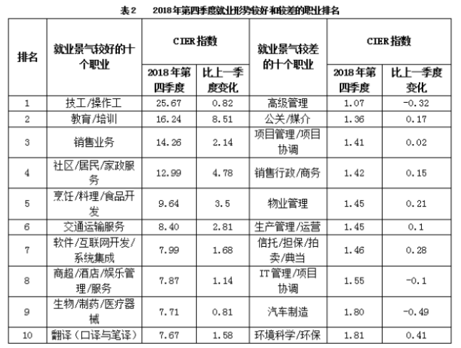 CIER指數(shù)用來反映就業(yè)市場景氣程度,其計算方法是:CIER指數(shù)=市場招聘需求人數(shù)/市場求職申請人數(shù)。根據(jù)有關(guān)機(jī)構(gòu)發(fā)布的數(shù)據(jù),2018年第一季度CIER指數(shù)為1.91,第二季度為1.88,第三季度為1.97,第四季度為2.38。2018年第三季度,招聘需求人數(shù)環(huán)比下降20.79%,求職申請人數(shù)環(huán)比下降24.37%;第四季度,招聘需求人數(shù)環(huán)比增加25.42%,求職申請人數(shù)環(huán)比增加3.9%。