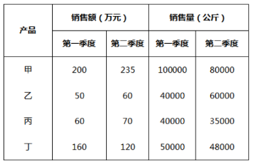 某水產(chǎn)公司共銷售甲、乙、丙、丁四種魚類產(chǎn)品。其在兩個季度的銷售額和銷售量情況如下: