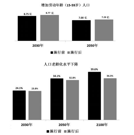 根據(jù)測算,全國城鄉(xiāng)普遍實施“單獨二胎”政策,將使總?cè)丝谠?030年達到14.53億,峰值人口增加1500萬;2050年,總?cè)丝谙陆禐?3.85億,但比現(xiàn)行生育率增加約5000萬人?!皢为毝ァ迸c現(xiàn)行生育政策相比,2030年老齡化水平從24.1%降低到23.8%;2050年從34.1%降到32.8%;直到2074年以后,該政策會影響老年人口數(shù)量。另外,城鄉(xiāng)普遍推行“單獨二胎”政策15年,勞動年齡人口規(guī)模開始增加,2030年15-59歲勞動年齡人口數(shù)量從8.75億升到8.77億;2050年從7.00億升至7.26億。