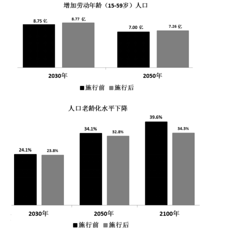 根據(jù)測(cè)算,全國(guó)城鄉(xiāng)普遍實(shí)施“單獨(dú)二胎”政策,將使總?cè)丝谠?030年達(dá)到14.53億,峰值人口增加1500萬(wàn);2050年,總?cè)丝谙陆禐?3.85億,但比現(xiàn)行生育率增加約5000萬(wàn)人?!皢为?dú)二胎”與現(xiàn)行生育政策相比,2030年老齡化水平從24.1%降低到23.8%;2050年從34.1%降到32.8%;直到2074年以后,該政策會(huì)影響老年人口數(shù)量。另外,城鄉(xiāng)普遍推行“單獨(dú)二胎”政策15年,勞動(dòng)年齡人口規(guī)模開始增加,2030年15-59歲勞動(dòng)年齡人口數(shù)量從8.75億升到8.77億;2050年從7.00億升至7.26億。