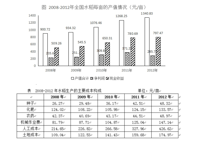 2013年全國水稻種植面積達(dá)4.55億畝,比上年增加260多萬畝。但由于強(qiáng)降雨及洪澇災(zāi)害,總產(chǎn)量較上年減少62萬噸,總產(chǎn)量為20361萬噸。下圖反映的是2008年至2012年我國水稻每畝的產(chǎn)值情況及水稻生產(chǎn)的主要成本構(gòu)成情況。