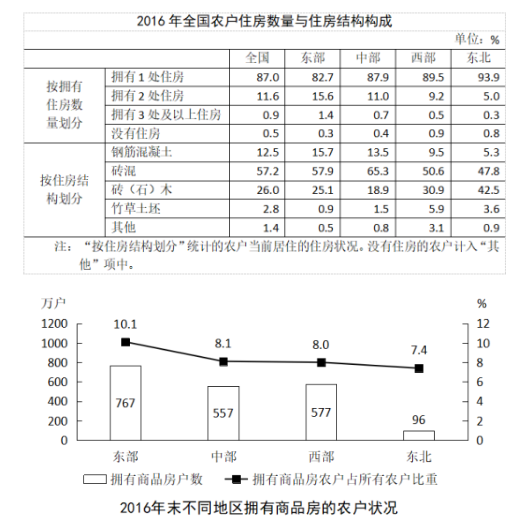 2016年末,全國(guó)23027萬(wàn)農(nóng)戶中,99.5%的農(nóng)戶擁有自己的住房。其中,擁有1處住房的20030萬(wàn)戶,占87.0%;擁有2處住房的2677萬(wàn)戶,占11.6%;擁有3處及以上住房的196萬(wàn)戶,占0.9%;擁有商品房的1997萬(wàn)戶,占8.7%。