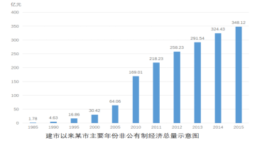 2015年,某市非公有制經(jīng)濟實現(xiàn)增加值348.12億元,比上年凈增加23.69億元,非公有制經(jīng)濟增加值占GDP的比重為57.5%。其中,民營經(jīng)濟增加值335.24億元,外商經(jīng)濟增加值11.84億元,港澳臺經(jīng)濟增加值1.04億元,分別比“十一五”(2010年)末增長104.3%、162.9%和147.4%。