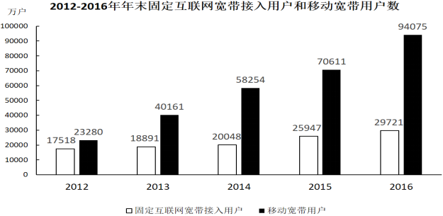 B、2016年固定互聯(lián)網(wǎng)寬帶接入用戶同比增長率高于移動寬帶用戶增長率