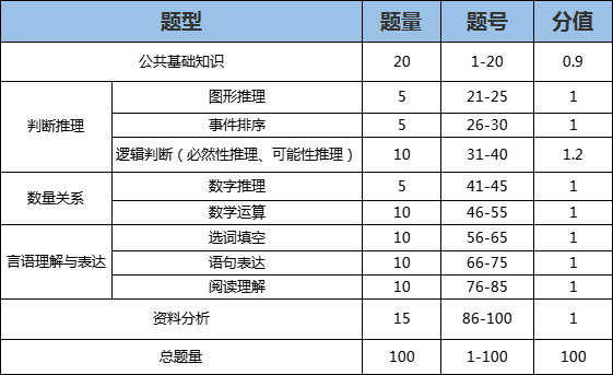 具體包含公共基礎(chǔ)知識、數(shù)量關(guān)系、言語理解與表達(dá)、判斷推理、資料分析五個方面。