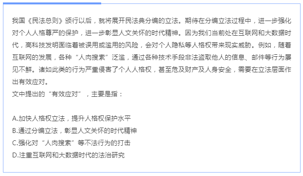 【解析】本題是語句理解題,側(cè)重考察對語句的理解是否全面和正確。首先找到 “有效應(yīng)對”,它在文段最后一句“需要在立法層面做出有效應(yīng)對”。根據(jù)就近原則向前找,“諸如此類的……需要……”,說明“有效應(yīng)對”解決的是“此類行為”,而“此類”需繼續(xù)向前找,前一句是例如,表舉例,繼續(xù)向前找,“會對個人隱私權(quán)等人格權(quán)帶來顯示威脅”,故應(yīng)對的是人格權(quán)帶來的威脅。所以 對比選項,A項提到“人格權(quán)”和“立法”。因此,選擇A選項。