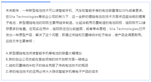【解析】這是一道主旨概括題。在 文段首句提出一種新型電池技術(shù)可以增加智能手機、汽車和智能手表的電池容量。后文明確該新型技術(shù),并且通過兩方面分析了該技術(shù)能增加電池容量的原因,一是硅陽極可以存儲更多電量,二是硅和石墨烯納米粒子的結(jié)合可以解決硅陽極比較脆弱的問題。所以文段是“總—分”結(jié)構(gòu),確定文段的前兩句為主旨句,全文論述的核心話題為“全新的鋰硅電池”。之后 對比選項。A項是對文段重點的同義替換。因此,選擇A選項。
