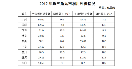 B、2012年珠三角九市中僅有1市合同利用外資額出現(xiàn)下降