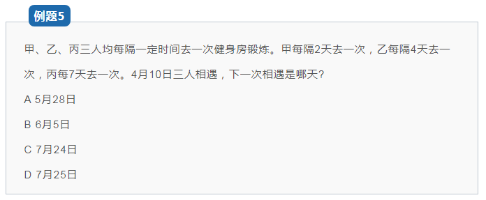根據(jù)題干可知,甲每隔2天去一次健身房,則甲去健身房的周期為2+1=3天,乙每隔4天去一次健身房,則乙去健身房的周期為4+1=5天,丙每7天去一次健身房,則丙去健身房的周期為7天,所以甲、乙、丙三人同時去健身房的周期為3×5×7=105天。4月10日三人相遇,下一次三人相遇在健身房相遇是在105天之后,此時4月還剩20天,5月有31天,6月30天,7月還剩105-81=24天,即7月24日三人再次相遇。故本題答案為C。