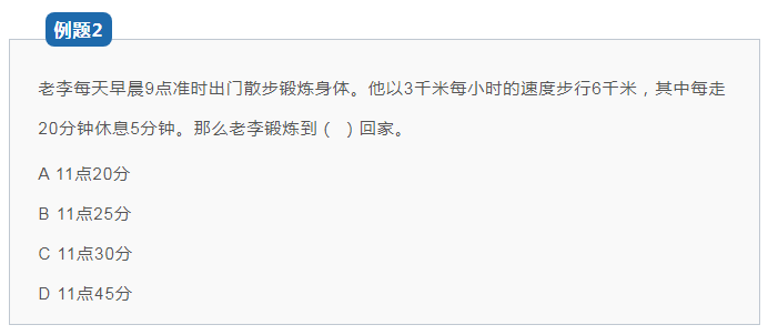 根據(jù)題意,老李速度為3千米每小時,路程6千米,即不休息的話,老李走完6千米需要6÷3=2小時。每20分鐘休息一次,即一個小時休息60÷20=3次,因為最后一次走完不涉及休息時間,即120分鐘的路程中間需要休息5次,休息總時間=5×5=25分鐘。所以老李鍛煉道家的時間為9點+2小時25分鐘=11點25分。故本題答案為B。