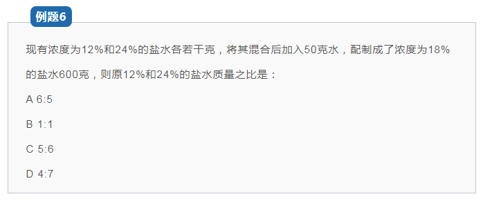 解析一:設(shè)濃度為12%的鹽水有x克,濃度為24%的鹽水有y克,混合后加入50克水得到濃度為18%的鹽水600克,則溶液總量600=x+y+50,混合前后含鹽量為12%x+24%y=18%×600,聯(lián)立兩式可解得x=200、y=350,則原12%和24%的鹽水質(zhì)量之比為200:350=4:7。故本題答案為D。
