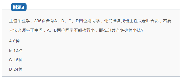 解法二:反向考慮。宋老師坐正中間,ABCD四位同學(xué)總坐法有A(4,4)=24種,若AB兩位同學(xué)挨著坐,則可捆綁后選擇宋老師左邊或右邊的兩個位置,有C(2,1)=2種,兩人內(nèi)部位置排列有A(2,2)=2種,剩余宋老師的另一邊則是CD兩人排列有A(2,2)=2種坐法,故AB同學(xué)挨著坐的情況共有2×2×2=8種。則不挨著坐的情況有24-8=16種。故本題答案為C。
