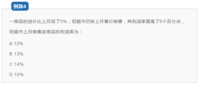 設(shè)該商品上月的進(jìn)價為100,商品的售價為x,則該商品本月的進(jìn)價為95,可得(x-95)/95-(x-100)/100=0.06,即x/95-x/100=0.06,解得x=114,則超市上月的利潤率為(114-100)/100=14%。故本題答案為C。