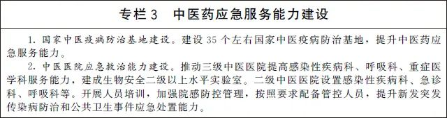 加強(qiáng)中醫(yī)藥應(yīng)急救治能力建設(shè)。依托高水平三級(jí)甲等中醫(yī)醫(yī)院,建設(shè)覆蓋所有省份的國(guó)家中醫(yī)疫病防治基地,依托基地組建中醫(yī)疫病防治隊(duì)伍,提升中醫(yī)緊急醫(yī)學(xué)救援能力。三級(jí)公立中醫(yī)醫(yī)院和中西醫(yī)結(jié)合醫(yī)院(不含中醫(yī)??漆t(yī)院)全部設(shè)置發(fā)熱門診,加強(qiáng)感染性疾病、急診、重癥、呼吸、檢驗(yàn)等相關(guān)科室建設(shè),提升服務(wù)能力。