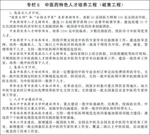 2.強(qiáng)化中醫(yī)藥特色人才隊(duì)伍建設(shè)。實(shí)施中醫(yī)藥特色人才培養(yǎng)工程(岐黃工程)。打造岐黃學(xué)者品牌,持續(xù)開展岐黃學(xué)者培養(yǎng)、全國(guó)中醫(yī)臨床優(yōu)秀人才研修等項(xiàng)目,做強(qiáng)領(lǐng)軍人才、優(yōu)秀人才、骨干人才梯次銜接的高層次人才隊(duì)伍。建設(shè)一批高水平中醫(yī)藥重點(diǎn)學(xué)科。構(gòu)建符合中醫(yī)藥特點(diǎn)的人才培養(yǎng)模式,發(fā)展中醫(yī)藥師承教育,建立高年資中醫(yī)醫(yī)師帶徒制度,與職稱評(píng)審、評(píng)優(yōu)評(píng)先等掛鉤,持續(xù)推進(jìn)全國(guó)名老中醫(yī)藥專家傳承工作室、全國(guó)基層名老中醫(yī)藥專家傳承工作室建設(shè)。將綜合醫(yī)院、婦幼保健院等醫(yī)療機(jī)構(gòu)中醫(yī)藥人才納入各類中醫(yī)藥人才培養(yǎng)項(xiàng)目。按照“下得去、留得住、用得上”的要求,加強(qiáng)基層中醫(yī)藥人才隊(duì)伍建設(shè),根據(jù)需求合理確定中醫(yī)專業(yè)農(nóng)村訂單定向免費(fèi)培養(yǎng)醫(yī)學(xué)生規(guī)模,在全科醫(yī)生特崗計(jì)劃中積極招收中醫(yī)醫(yī)師。推廣中醫(yī)藥人員“縣管鄉(xiāng)用”,探索推進(jìn)輪崗制與職稱評(píng)審相銜接。適當(dāng)放寬長(zhǎng)期服務(wù)基層的中醫(yī)醫(yī)師職稱晉升條件,表彰獎(jiǎng)勵(lì)評(píng)優(yōu)向基層一線和艱苦地區(qū)傾斜,引導(dǎo)中醫(yī)藥人才向基層流動(dòng)。
