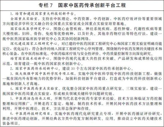 3.建設(shè)高層次科技平臺(tái)。依托現(xiàn)有資源,建設(shè)一批國(guó)家級(jí)中醫(yī)藥研究平臺(tái),研究布局全國(guó)重點(diǎn)實(shí)驗(yàn)室、國(guó)家臨床醫(yī)學(xué)研究中心、國(guó)家工程研究中心和國(guó)家技術(shù)創(chuàng)新中心;推進(jìn)國(guó)家中醫(yī)藥傳承創(chuàng)新中心、國(guó)家中醫(yī)臨床研究基地和中國(guó)中醫(yī)藥循證醫(yī)學(xué)中心建設(shè)。發(fā)揮中國(guó)中醫(yī)科學(xué)院“國(guó)家隊(duì)”作用,實(shí)施中醫(yī)藥科技創(chuàng)新工程。
