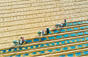 一年之計在于春。做好春耕備耕工作,事關(guān)糧食安全大局。圖為2022年3月11日,在甘肅省張掖市臨澤縣平川鎮(zhèn)一工程村6500多畝制種玉米地里,農(nóng)戶們正忙碌著覆膜保墑。求是圖片王將/攝