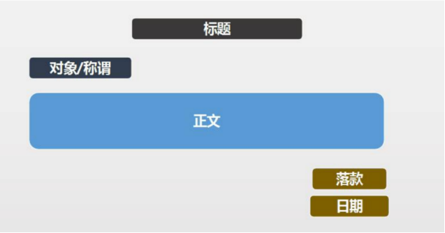 在圖片上,我們可以清晰地看到應用文的格式包括五個要素:一是標題,位置需要居中,也就是前后空格一樣多;二是對象,位置需要另起一行頂格寫,表明該篇應用文是發(fā)給哪個單位的;三是正文,向發(fā)文對象闡明發(fā)文的目的和要求,該部分內(nèi)容要符合“工作目標”;四是落款,位置靠右,表明發(fā)文單位;五是日期,位置靠右,與上一行的“落款”對齊。