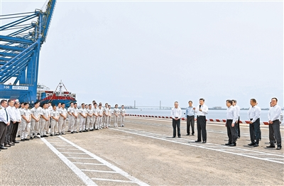 隨后,習(xí)近平來到洋浦國際集裝箱碼頭小鏟灘港區(qū),了解港口建設(shè)發(fā)展情況,同現(xiàn)場作業(yè)人員、掛職干部代表等親切交流。習(xí)近平強(qiáng)調(diào),振興港口、發(fā)展運(yùn)輸業(yè),要把握好定位,增強(qiáng)適配性,堅(jiān)持綠色發(fā)展、生態(tài)優(yōu)先,推動港口發(fā)展同洋浦經(jīng)濟(jì)開發(fā)區(qū)、自由貿(mào)易港建設(shè)相得益彰、互促共進(jìn),更好服務(wù)建設(shè)西部陸海新通道、共建“一帶一路”。他指出,黨中央選派干部來自由貿(mào)易港掛職,既體現(xiàn)了黨中央對自由貿(mào)易港建設(shè)的關(guān)心和支持,也是對干部的培養(yǎng)鍛煉,要發(fā)揮掛職干部的積極作用,讓他們在基層一線增長才干。