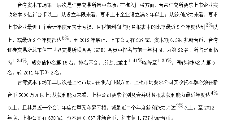 臺灣資本市場第三層次為興柜市場。在準(zhǔn)入門檻方面,興柜市場沒有營業(yè)利潤、資本額、設(shè)立年限的限制,只需符合已經(jīng)申報上市或上柜輔導(dǎo)且兩家以上證券商書面推薦。至2012年底,興柜公司285家,資本額0.335兆新臺幣,總市值0.538兆新臺幣。