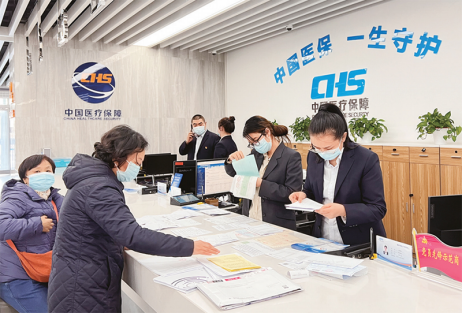 中國用較短時(shí)間建立起世界最大的全民基本醫(yī)療保障網(wǎng),對(duì)破解群眾看病難看病貴問題、支持醫(yī)藥衛(wèi)生事業(yè)發(fā)展、維護(hù)社會(huì)穩(wěn)定和推動(dòng)共同富裕發(fā)揮了重要作用。圖為2022年3月1日,甘肅省酒泉市醫(yī)保經(jīng)辦窗口工作人員正在為群眾辦理醫(yī)保業(yè)務(wù)?!裔t(yī)療保障局供圖 鄭惠亞/攝