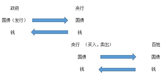 通過這張圖示大家可以看出來,當政府和央行之間流通國債是屬于財政政策的,當政府發(fā)行國債后,并不是直接和百姓進行交易,是賣給央行,政府拿到錢之后會用于彌補財政赤字,基礎(chǔ)設(shè)施建設(shè),所以這個時候市場當中的貨幣供應量會增加。當央行賣出國債的時候會把國債賣個百姓,百姓把錢給央行,會導致市場中的貨幣供應量減少。