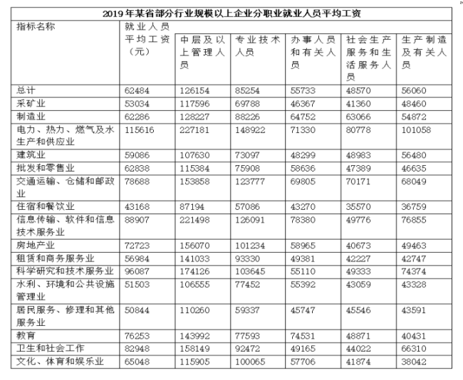 2019年某省規(guī)模以上企業(yè)就業(yè)人員年平均工資為62484元,比上年增長10.1%。其中,中層及以上管理人員增長9.7%;專業(yè)技術(shù)人員增長20.7%;辦事人員和有關(guān)人員增長5.7%;社會(huì)生產(chǎn)服務(wù)和生活服務(wù)人員增長8.5%;生產(chǎn)制造及有關(guān)人員增長9.7%。
