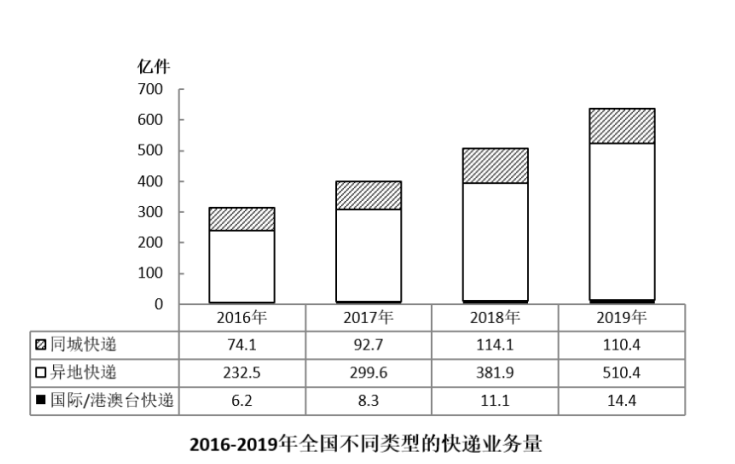 99.如保持2019年同比增量不變,則全國異地快遞業(yè)務(wù)量將在哪一年首次達(dá)到同城快遞業(yè)務(wù)量的10倍以上?( )