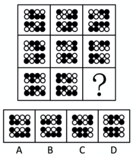 例3:從所給的四個(gè)選項(xiàng)中,選擇最合適的一個(gè)填入問號(hào)處,使之呈現(xiàn)一定的規(guī)律性:( )