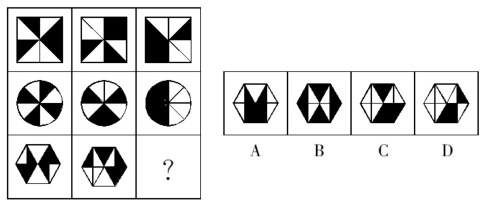 【答案】B【解析】題干圖形均為軸對稱圖形,且圖形的對稱軸依次順時(shí)針旋轉(zhuǎn)45°,因此問號(hào)處的圖形應(yīng)具有向右傾斜45°的對稱軸,排除A、C。再次觀察圖形發(fā)現(xiàn),奇數(shù)項(xiàng)圖形中對稱軸與圖形的某一線段重合,偶數(shù)項(xiàng)圖形中對稱軸不與圖形中的任一線段重合。問號(hào)處為第六個(gè)圖形,應(yīng)選擇對稱軸不與圖形中任一線段重合的圖形,排除D。故本題選B。