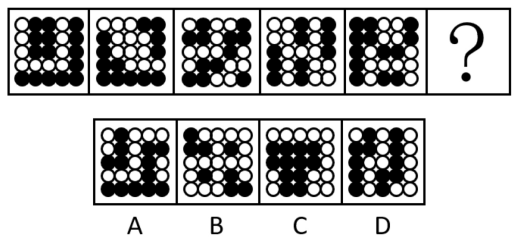 【答案】A【解析】首先分析題干特征,黑色與白色數(shù)量明顯非常多,移動(dòng)與疊加無從入手,可以先從整體上去看特征。我們會(huì)發(fā)現(xiàn),題干的五個(gè)圖形,白球的排列相對來講比較規(guī)律,那我們就單獨(dú)來看白球的部分,第一個(gè)圖形白球呈現(xiàn)的是軸對稱特征,第二個(gè)是中心對稱,第三個(gè)軸對稱,第四個(gè)中心對稱,第五個(gè)軸對稱,所以問號(hào)處要選擇一個(gè)白球部分是中心對稱的圖形。選項(xiàng)中只有A選項(xiàng)符合特征。
