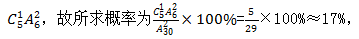 5排共有30個格子,每排格子數(shù)相同,則每排有30÷5=6個格子。由于兩個棋子相互制約,并且先放綠色還是先放紅色不影響最終結(jié)果,并且第一個棋子選哪個位置,并不會影響第二個棋子的放置,所以我們可以用定位法去處理。先從30個格子中任選1個安排紅色棋子,此時還剩下29個空格子。若想2個棋子在同一排,則綠色棋子只能挑選紅色棋子所在排剩余5個格子中的一個,故2個棋子在同一排的概率為