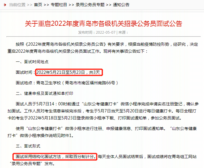 確定啦!確定啦!2022年青島公務(wù)員面試重啟時間確定:2022年5月21日至5月23日,共3天